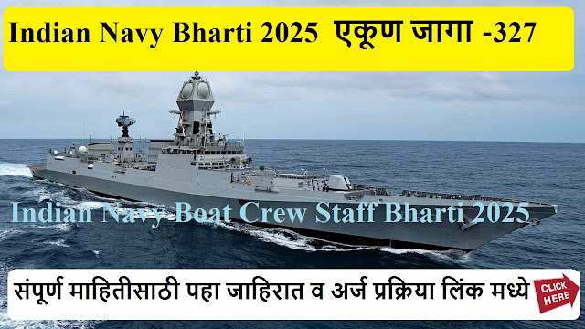 भारतीय नौदलानि प्रसिद्ध केलेल्या जाहिराती नुसार येथे “बोट क्रू स्टाफ” पदाच्या एकूण 327 रिक्त जागांसाठी अर्ज मागविण्यात येत आहेत. इच्छुक आणि पात्र उमेदवारांनी 01 एप्रिल 2025 या तारखेपर्यंत ऑनलाईन अर्ज करावे तसेच खालील संपूर्ण माहिती बघावी.